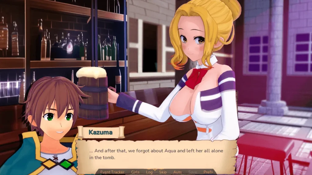 The writing is the star. With over 160,000 words in the current build, the game has ample room to develop its characters beyond mere parody. Yes, the situations are often absurd and the dialogue is laugh-out-loud funny, but you also get moments of genuine character growth and camaraderie. The game understands that the heart of a good Konosuba parody isn’t just the gags, but the found-family dynamic of a group of lovable misfits struggling (and mostly failing) to be competent adventurers. Exploring the town, taking on quests at the guild, and hearing your party members bicker feels authentic and immersive.