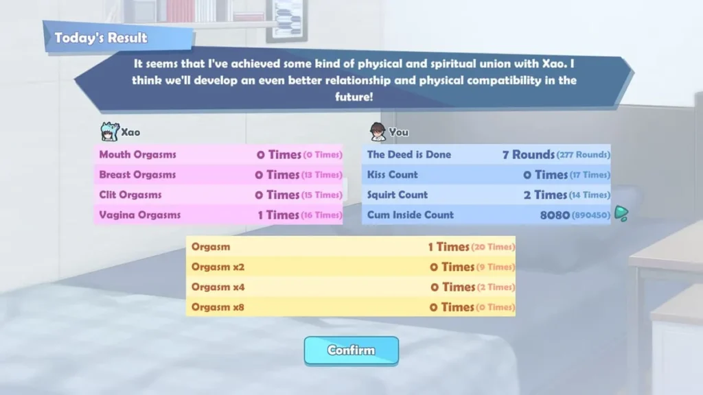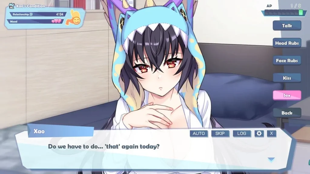 It starts early with a tutorial scene that establishes your close, trusting bond with Xao. Successfully navigating this interaction provides a massive, one-time boost to her Mood and Affection meter, unlocking new dialogue options and making her more responsive to your management. This sets the tone: these moments are presented as consensual milestones in your relationship, rewards for effective care and management.